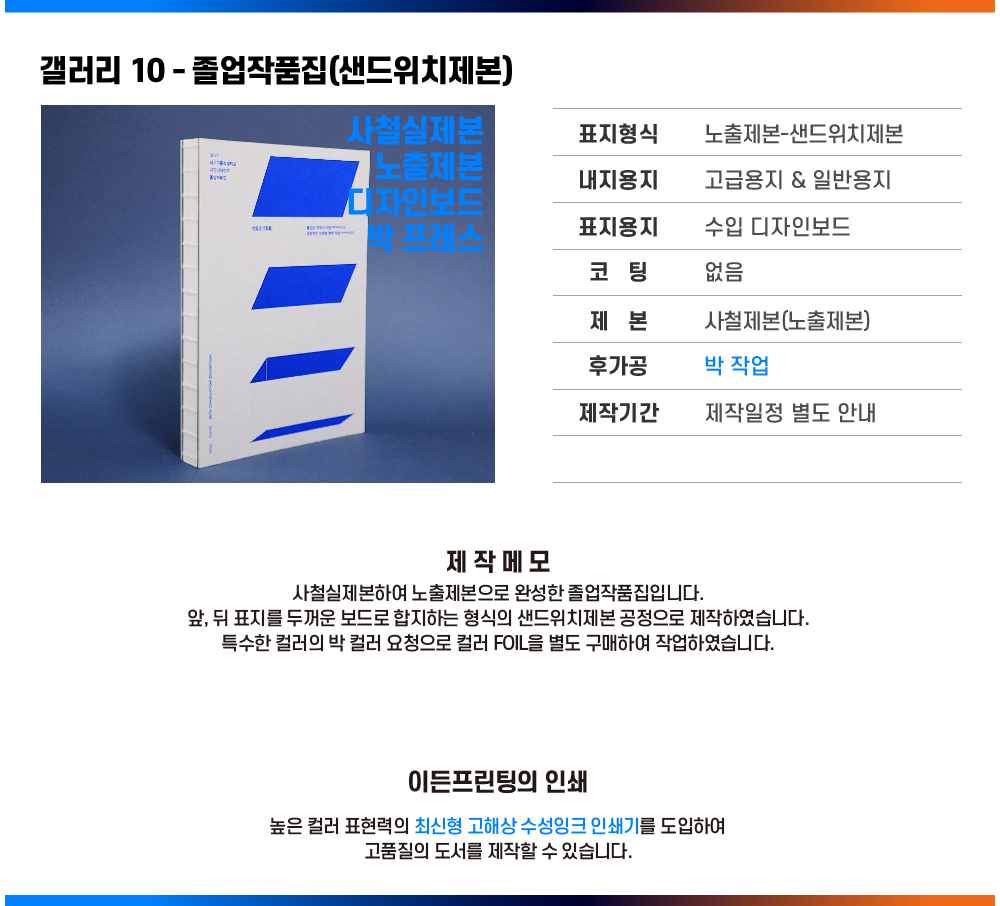 갤러리 10 졸업작품집 - 사철제본 ㅣ 노출제본 ㅣ 보드합지(샌드위치제본) ㅣ 디자인보드(수입) ㅣ 표지 박 후가공
