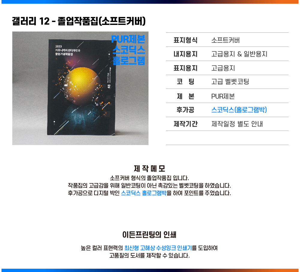 갤러리 12 졸업작품집 - PUR제본 ㅣ소프트커버ㅣ벨벳코팅 ㅣ 스코딕스 홀로그램