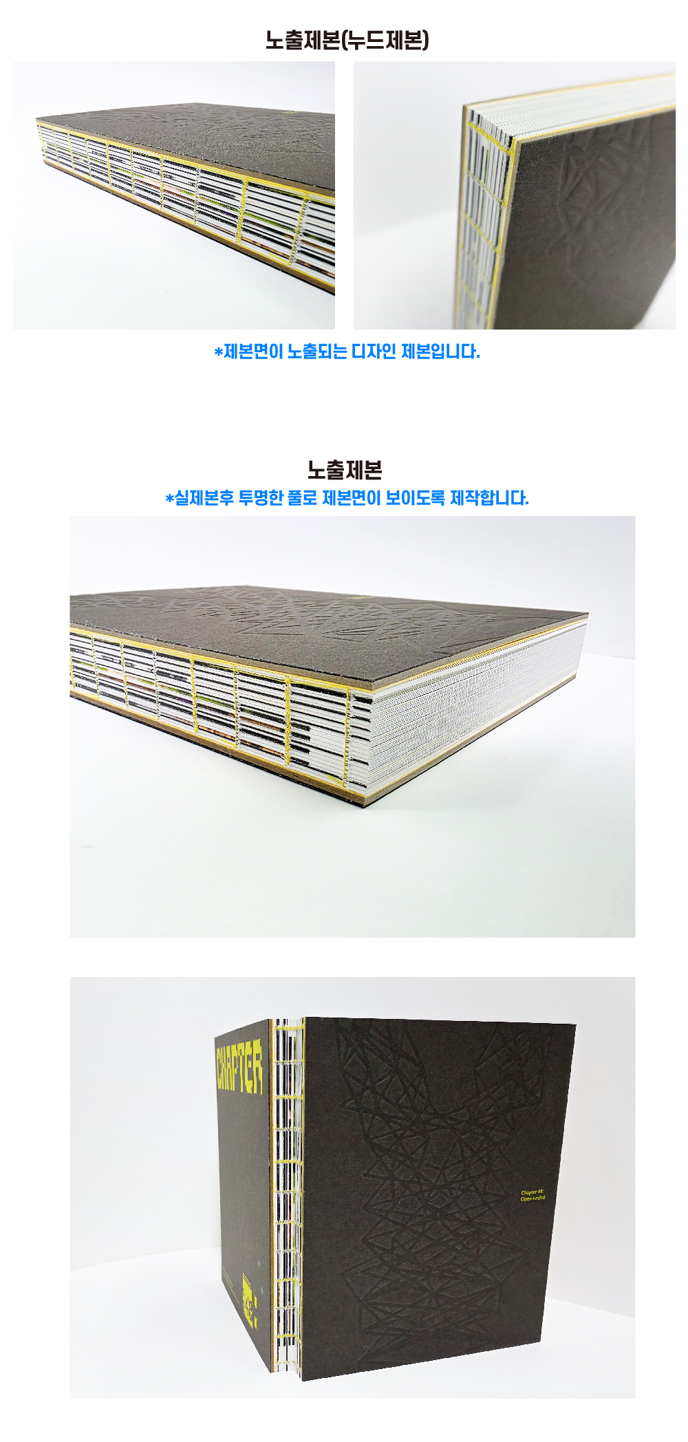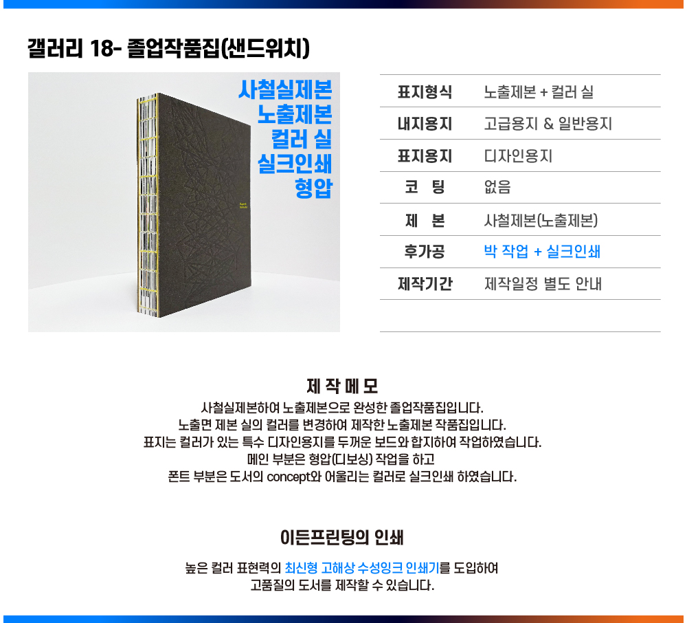 갤러리 18 졸업작품집 - 사철제본 ㅣ 노출제본 ㅣ 보드합지(샌드위치제본) ㅣ 제본실 컬러변경 ㅣ 특수지 표지(수입) ㅣ 형압 ㅣ 실크인쇄