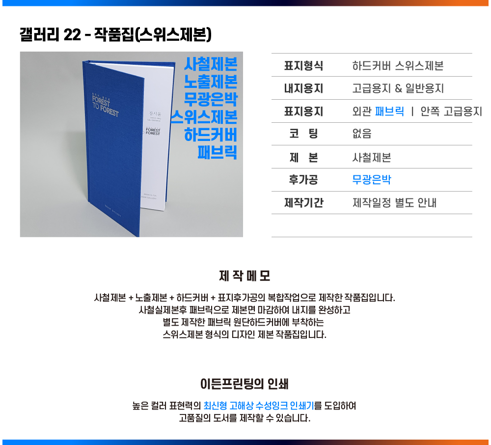 갤러리 22 작품집 - 사철제본 ㅣ 제본면 패브릭 마감(투톤) ㅣ 하드커버 스위스제본 ㅣ 패브릭 원단 ㅣ 무광은박