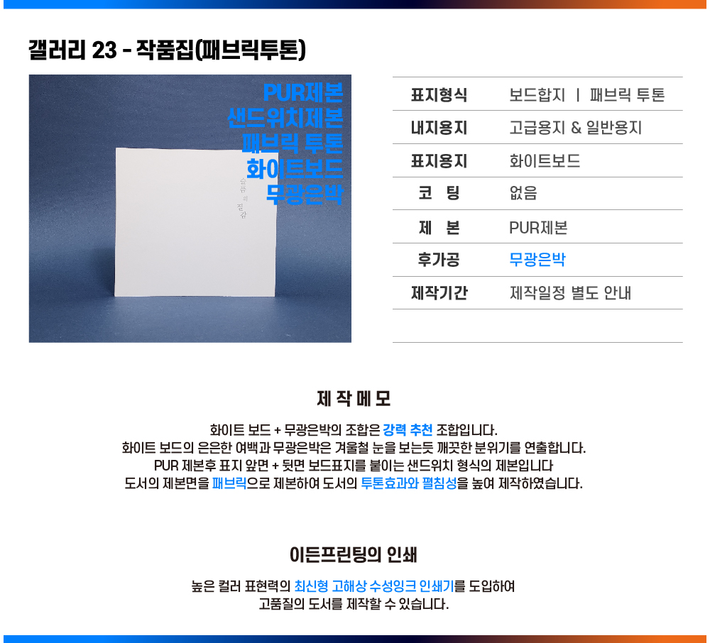 갤러리 23 작품집 - PUR제본 ㅣ 보드합지(샌드위치제본) ㅣ 제본면 패브릭마감(투톤) ㅣ 화이트 보드 ㅣ 무광은박