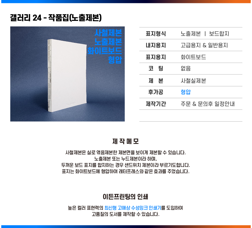갤러리 24 작품집 - 사철제본 ㅣ 노출제본 ㅣ 보드합지(샌드위치제본) ㅣ 화이트보드 ㅣ 형압(디보싱)