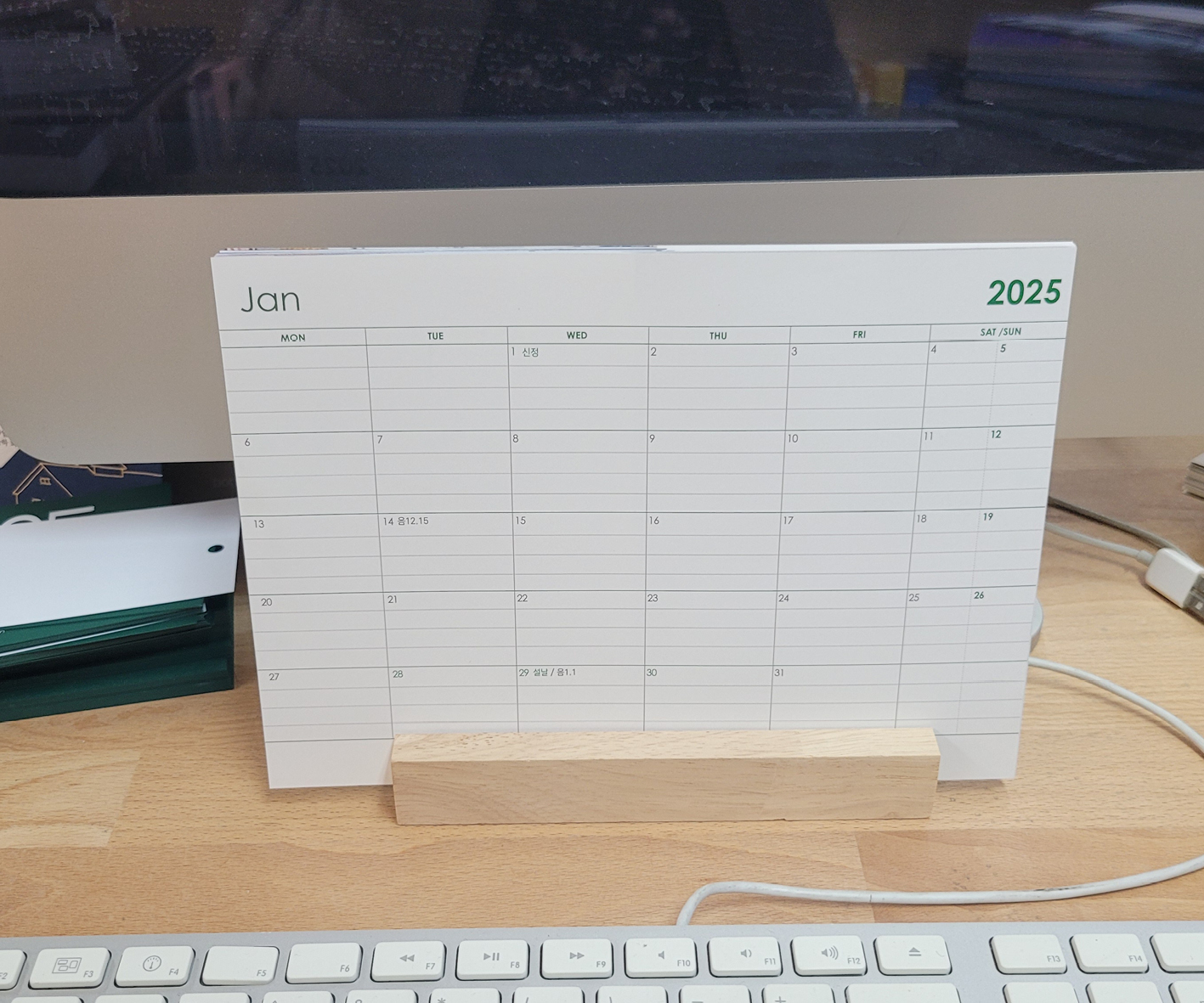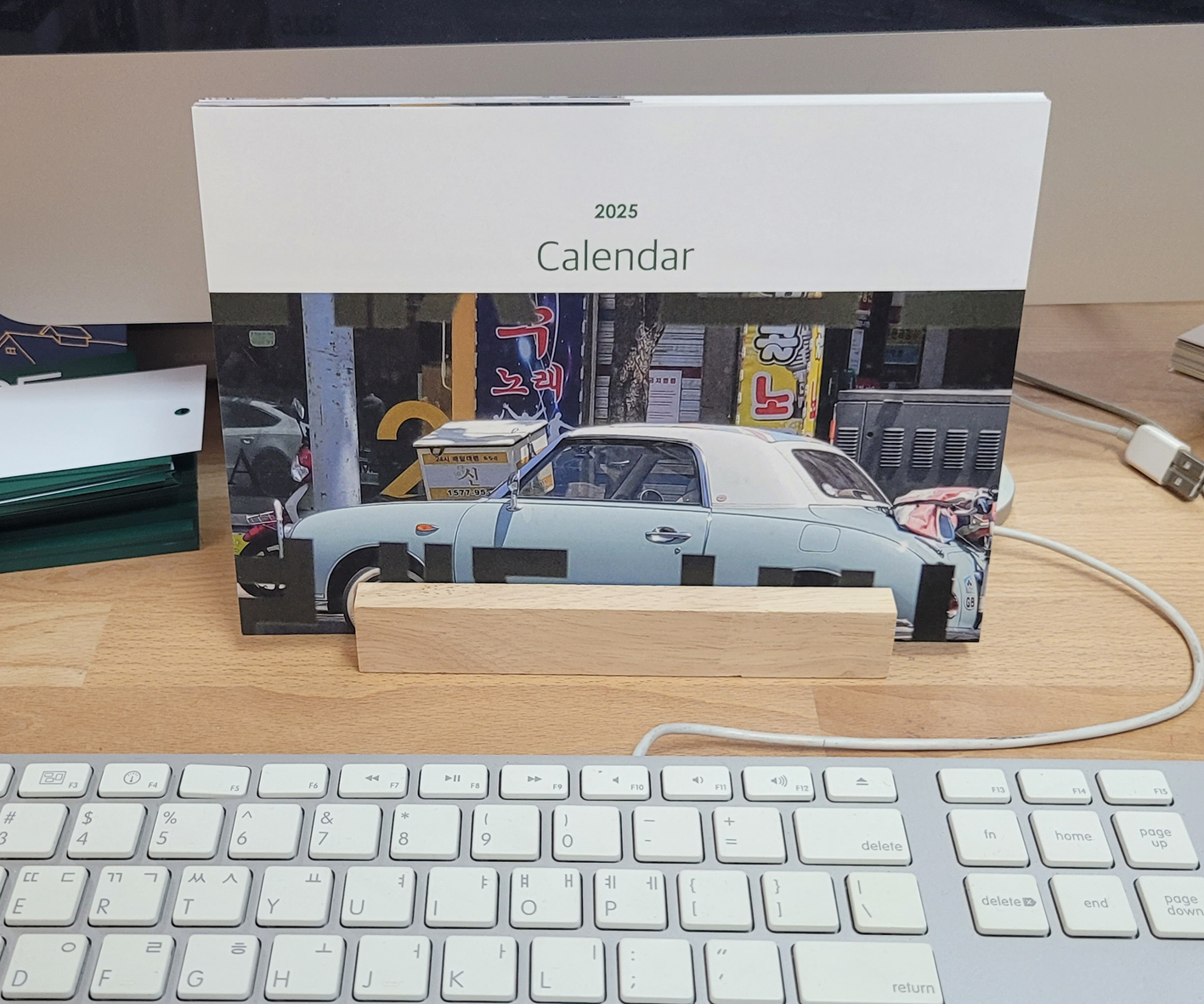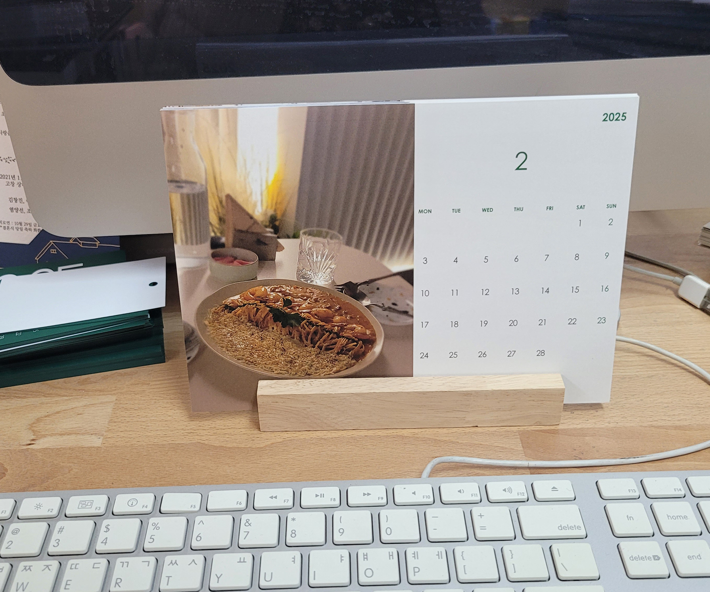 2025년 사진으로 1년 내내 행복항 달력을 제작해드립니다.원목받침에 세워놓은 엽서형달력 뒷면 월간스케줄이 있어서 메모하기 좋은 원목달력 1부 제작도 가능합니다.