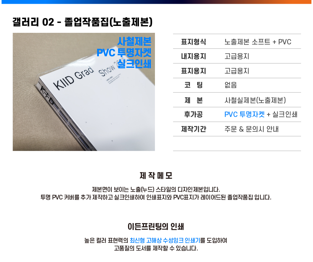 갤러리02 졸업작품집 - 사철제본 ㅣ 노출제본 ㅣ PVC 투명자켓 ㅣ 실크인쇄